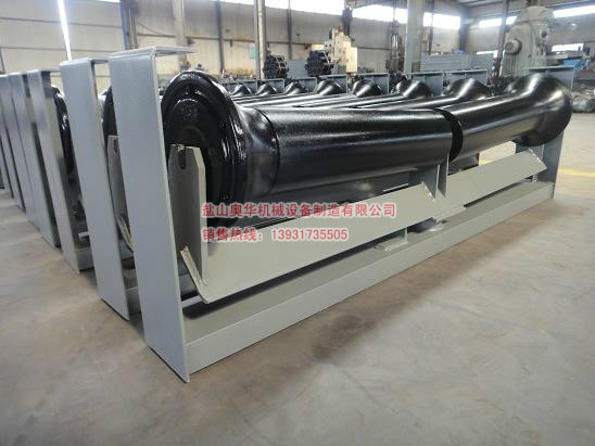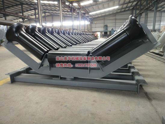The self-adjusting idler roller group is an automatic adjusting roller. When the tape deviation, the belt side of the friction contact with the friction head, the internal friction plate friction plate has the appropriate resistance to drive the activities of the roller bracket deflection group, when the roller rotation direction and belt running direction inconsistencies, resulting in tilt Angle and relative speed, resulting in corrective effect on the belt.